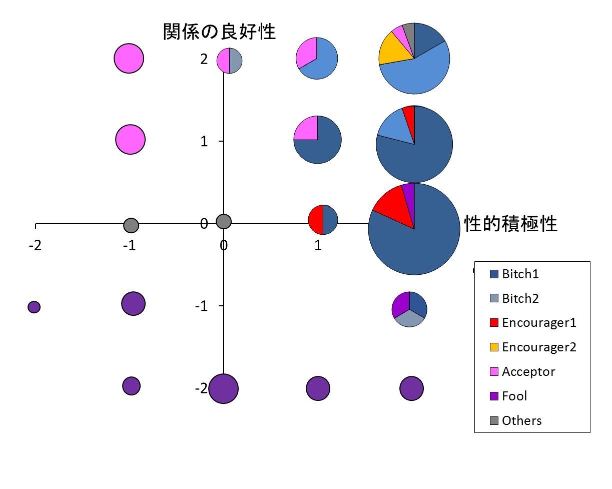 二つの尺度に基づいてタイプを設定したため、当然ではあるのですが、各タイプは散布図上で一定のまとまりを形成しており、例えばBitch1型は性的積極性が1~2・関係の良好性が0~1に集中して分布することが分かります。