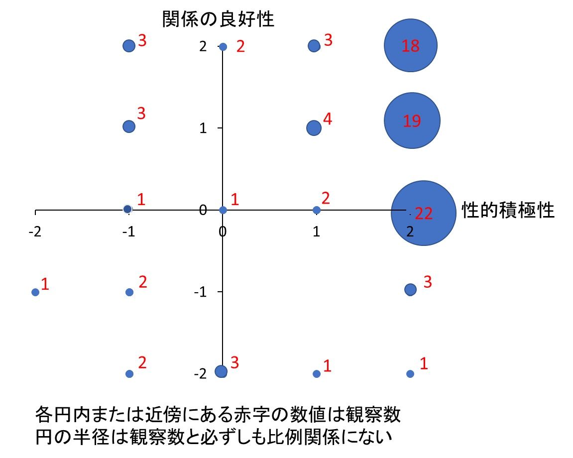 まず、図1に二つの順序尺度を軸として、各組み合わせの観察個体数を併記した散布図を示します。