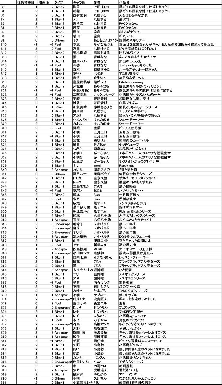 この定義に基づき、作中において一定の描写量があり(モブ的なキャラクターを除くため)、かつ黒ギャルと非黒ギャルの二つの状態が存在する場合は黒ギャルの状態でエロシーンが存在しているキャラクターをピックアップしました。