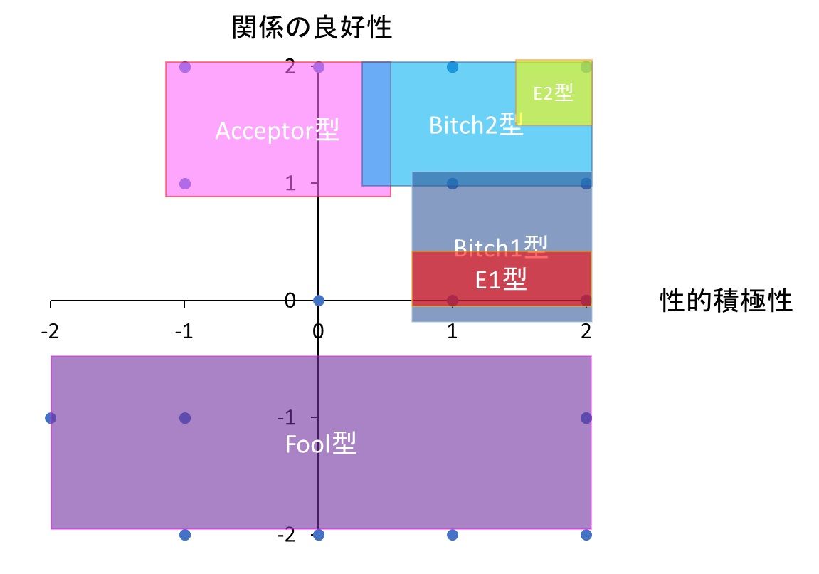 Encourager型とBitch型を分別するパラメーターが入っていないので、両者が混在しているのですが、E2型は性的積極性が2・関係の良好性が2のみに分布し、E1型は性的積極性が2・関係の良好性が0に集中する傾向が認められます。個体数の少なさが影響している可能性はありますが、Encourager型とBitch型が作中で果たす役割の違いとも関係していそうで興味深くあります。各タイプの分布を散布図上で概念的に表示すると図4のようになります。